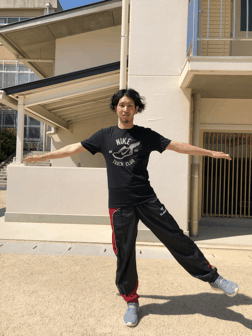 片足で立って,浮かせた方の足を大きく左右に振る。