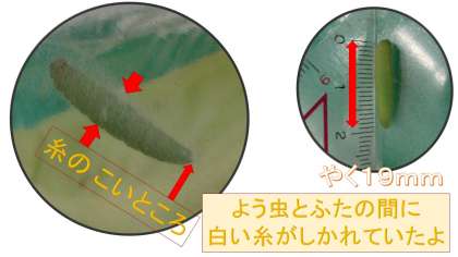 体のまわりにほそい糸がうっすらとしきつめられていました。よう虫のおなかのあたりとおしりの3かしょ,糸がこくなっていて,しっかりとふたにくっついていました。
