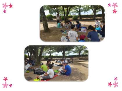 まず,手を洗って消毒し,日陰でお弁当をいただいています。