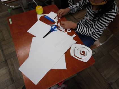 「スイスイ,グルグル,ジグザクと切ってごらん。」と話すと,みんなが大喜びで大きな白い画用紙をチョキチョキ切っていきました。