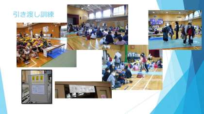 1回目とは違うところにガラス片が,あると想定しての安全経路の確保をしたのち体育館に避難します。人数確認をしてから 兄弟学年のところに移動して引き渡しが始まります。