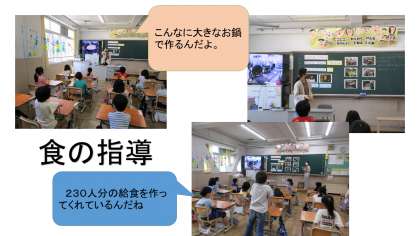 野菜や食器などを毎日3回も洗っていることや,大きなお鍋でおよそ230人分の給食を作ってくださっていることを知り,「大変やん!」「すごいなあ。」などいろいろな声が子ども達から聞こえてきました。