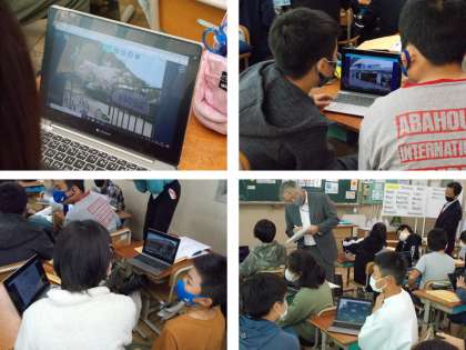安朱の町の良いところを紹介し合いましt。もちろん,英語で伝えます。先生のデモンストレーションビデオを見た後,タブレットで画像なども見せながら,自分が知っている話し方や身振り手振りを使って,友達と会話を楽しみました。