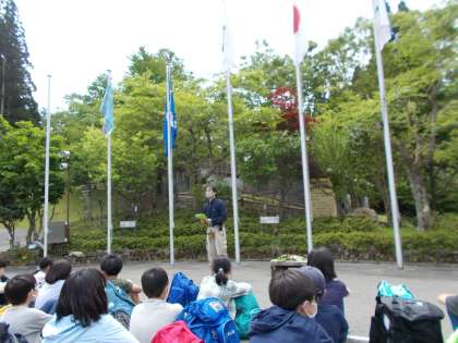 入所式の後,所員の先生から花背の植物についてお話を聞きました。見たこともないくらい大きな花を見せてもらい,もっともっと自然を探してみたくなりました。