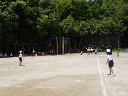 運動場でソフトボール投げをしました。1年生の時は測定しなかったので,2年生で初めて実施する種目です。練習をした後,2回実施しました。友達同士で安全に気を付けながら,ボール拾いもしました。