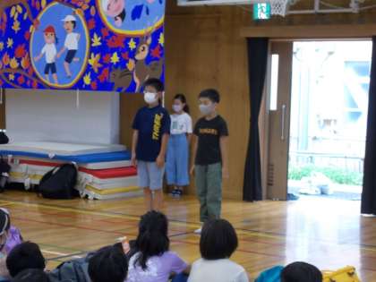 体育館での出発式では、校長先生からの「黄金の2日間にしましょう。」との言葉や児童代表の「誓いの言葉」、増田先生からは「学んで成長して帰ってきましょう。」との話がありました。