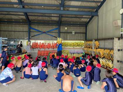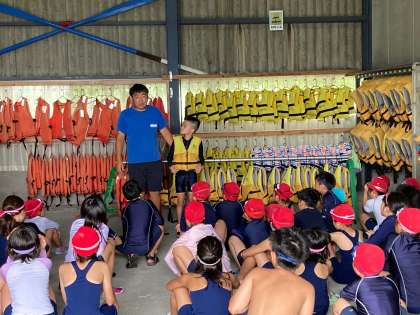 今からライフジャケットを着て、完成した筏に乗ります。