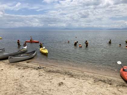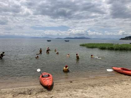 子ども達の元気な声が、湖の家の浜に戻ってきました。子ども達は元気いっぱいで、水分補給後、また琵琶湖を満喫しています。
