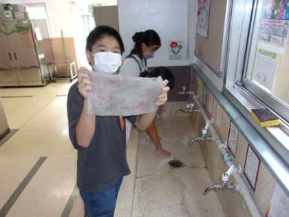 こすったり,もんだり,一生懸命に洗って,どの班のぞうきんもピカピカになりました。