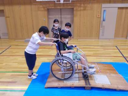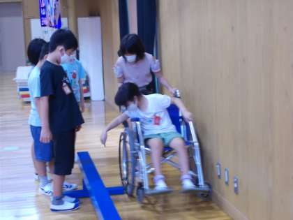 1日に車いす体験を行いました。初めての体験に初めは楽しさを感じる子もいたようですが、実際に乗って生活をするということを考えると大変さや不安などを考えることができました。自分に何ができるかを考えて行動していけるといいですね。