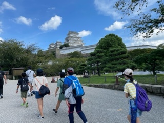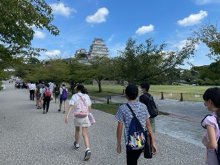 姫路城に到着しました。国宝、世界文化遺産にふれる体験となりました。 シラサギが羽を広げたような優美な姿から「白鷺城」の愛称で親しまれる姫路城。子ども達が、歴史にふれる貴重な機会になりました。
