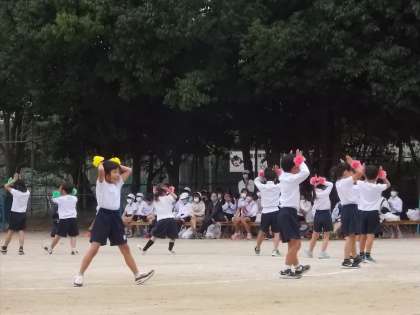 団体演技では、1年生が「ジャンボリー ヤクシー!!」を、笑顔いっぱいで楽しく踊りました。