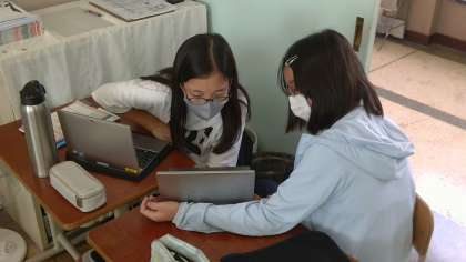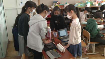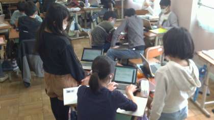社会科の学習で、タブレットを使って室町文化について調べ、文化の特徴を紐解くキーワードは何かを話し合いました。