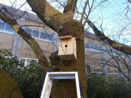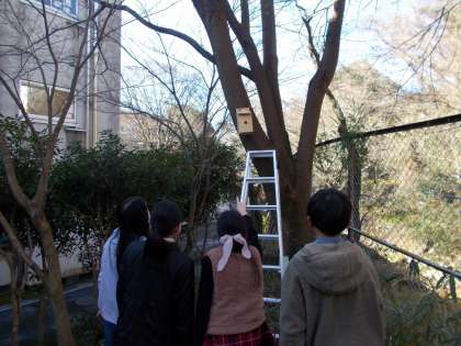 12月23日、総合的な学習の時間に野鳥のための巣箱を設置しました。「野鳥の保全」に取り組んでいる班のメンバーが協力して作ったものです。理科室裏の場所に設置しています。来年、無事に巣として使ってくれるのか、とても楽しみです。
