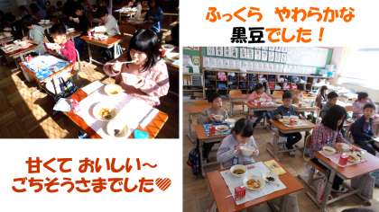 今日から給食が始まりました。年末に安朱校にもスチームコンベクションが導入されたので、スチコンで作る黒豆が出ました。「いつも食べていた黒豆よりも柔らかくておいしかった」と子どもたちから大評判!