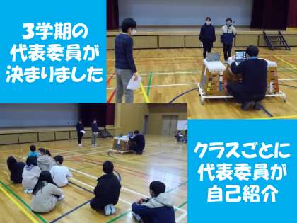 今月の児童集会は、3学期の代表委員の紹介がありました。3年生から6年生までの各クラスから2名ずつが選出され、クラスをまとめてくれます。頑張ってくださいね。