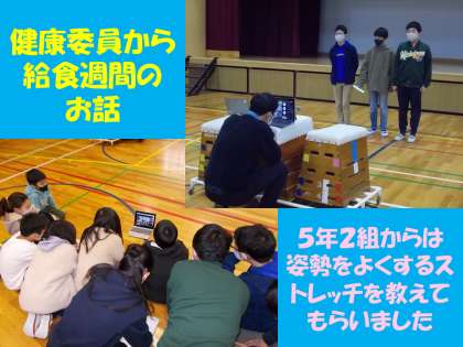 後半は、健康委員会から、給食週間についてのお話がありました。今日から給食週間。給食調理員さんのお仕事がわかるビデオや豆つかみ大会についても知らせてくれました。