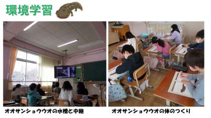京都水族館の方々とオオサンショウウオからその周辺の自然環境について考える学習をオンラインで行いました。オオサンショウウオや自然の大切さについて学ぶことができました。京都はオオサンショウウオの数少ない生息地だと知り「オオサンショウウオが住みやすい環境をつくっていきたいな」「地域の川もきれいなままでたもちたいな」という思いを持つことができました。質問にもたくさんお答えいただき、子どもたちはとても楽しく学べた様子でした。