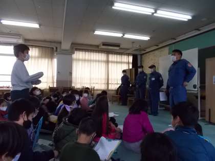 安朱消防分団の方をお招きして、地域の安全を守る取組についてお話を聞きました。