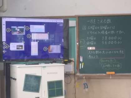 二つの大きな数の比べ方を考えました。ノートに説明を自分の言葉で書き、それを友達に伝えるために、ロイロノートを使ってみんなで共有しました。