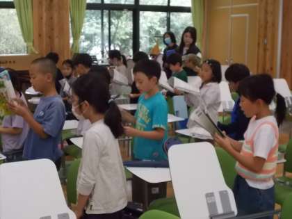 「とどけよう このゆめを」の曲を歌ったりリコーダーで演奏したりしました。全員でリコーダーの指使いを確認して練習した後、グループにわかれて、歌グループとリコーダーグループで合同で曲を楽しみました。