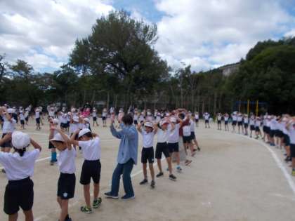 昨年度から、全校で踊っている新:安朱音頭。今年も1〜6年生全員で踊りました。地域の方も輪の中に入っていただき、笑顔で一緒に踊ることができました。