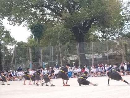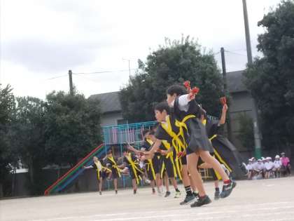 4年生は民舞「よっちょれ」を、鳴子を鳴らしながら踊りました。腰を低く落とし、力強さを表現しました。黒い法被もカッコよかったですね。