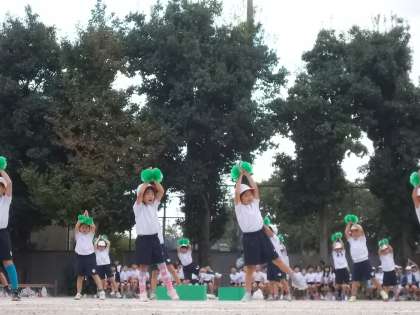 緑のポンポン飾りを手に付けて、ピーマン体操をしました。一つ一つの動きがかわいかったです。また、フォークダンス「ヤクシー」を踊りました。サビの部分では、2年生以上の子ども達も1年生に合わせて両手を高く上げて、「ヤクシー!」と掛け声。全校が一つになった瞬間でした。