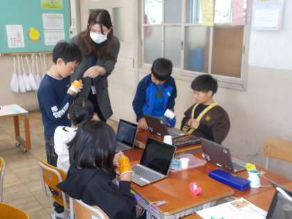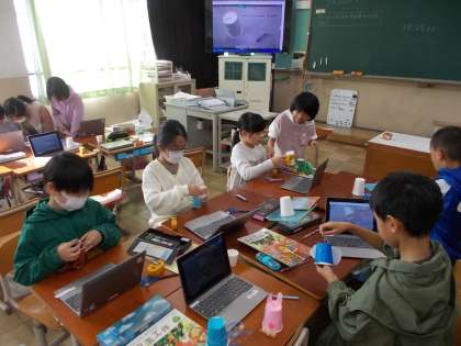 下から上へスルスルのぼる仕掛けを使って、おもちゃを作っています。友達にうまく動くコツを教わりながら、改良を加えていました。