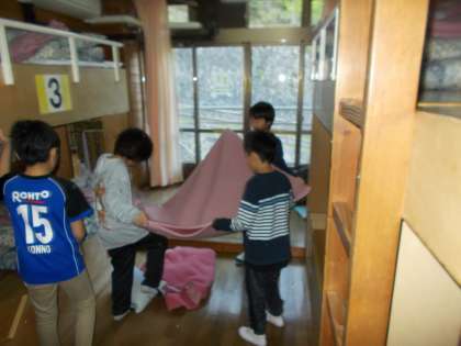 起床の音楽が館内に流れると,子ども達は身支度,洗顔などを済ませ,寝床の整理整頓も声を掛け合いながら協力して行うことができました。また,朝の集いの10分前には,忘れ物がないかを確認し合い,玄関前に向かうことができました。「5分前行動」「10分前準備」を意識して行動できています。立派です!