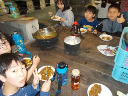 カレーライスの出来上がり! 担任の先生は,全部のグループのカレーライスを食べて回って,それぞれにコメントをつけてくれました。材料と分量は同じはずなのに,味はそれぞれ全く違ったものになったそうです。でも,どの班も,みんなで力を合わせ,団結して作ったカレーライス! 最高の出来上がりになりました。食べたときの笑顔も最高でした。