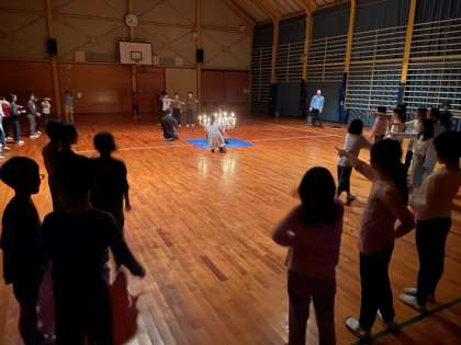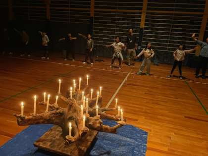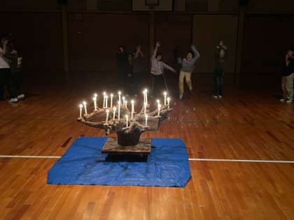 みんなが楽しみにしていたキャンドルファイヤーが始まりました。火の神様と3人の火の子が火を灯してくれ、スタート。ゲームやダンスで盛り上がりました!