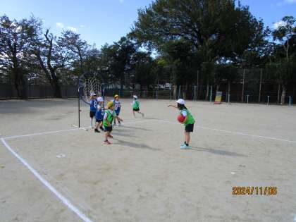 今日は、パスゲーム3時間目です。準備の仕方やルールに慣れてきて、楽しめるようになってきました。「こっちに投げて。」「ゴールの方に走ろう。」と声をかけ合いながらがんばっています。