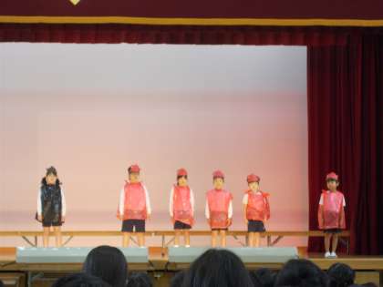 2年生は、お面や衣装を身につけて、スイミーを音読したり演じたり、歌を歌ったりしました。手作りした海の生き物たちも、とてもきれいでした。