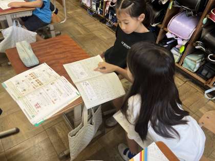 算数科「わり算」の学習では、40÷4や0÷4など答えが九九にないわり算の仕方を考えました。「かける数が1ふえると、答えはかけられる数だけ大きくなるきまりを使えそう!」「0にどんな数をかけても答えは0だから・・・・」など、今までの学習を思い出しながら問題に取り組んでいます。