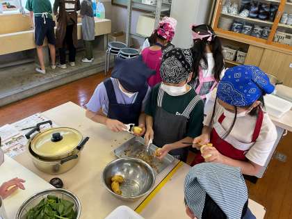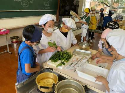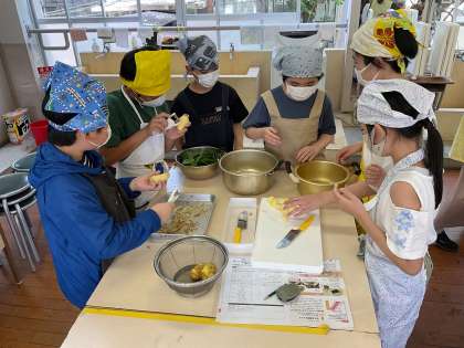 2回目の調理実習はじゃがいもとほうれん草をゆでました。1回目同様、グループの友達と相談して役割分担をし、テキパキと調理を進めていました。じゃがいもは塩をふって、ほうれん草はかつお節としょうゆをかけて食べました。「じゃがいもは素材の味を感じてめっちゃおいしい!」「自分で調理するとこんなにおいしいんだ!」と感想を口にしていました。