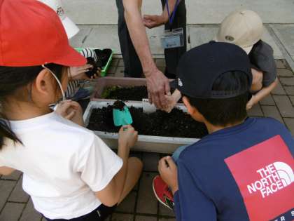 理科は、専科の先生と一緒に学習を進めています。この日はプランターにホウセンカの苗を植え替えました。「どんな花が咲くのかな?」「何色かな?」と予想しながら、苗の様子を観察しました。