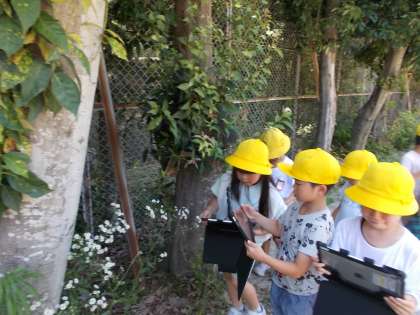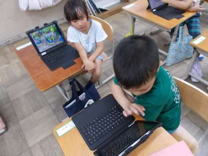 教室で夏みつけの交流をするためにタブレットで写真を撮っていました。