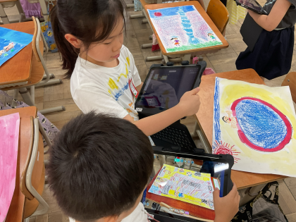 今日は鑑賞をしました。友だちの作品のいいところみつけをしたり、