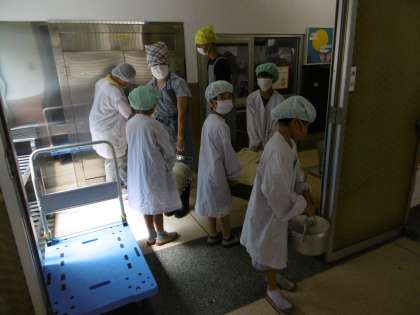 給食室の前で「いただきます!」
