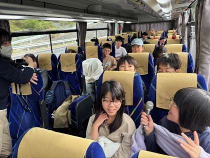 そのあと、バスレクリエーションが始まりました。地名クイズ、逆さ言葉クイズ、船長さんの命令ゲーム、食べ物しりとり…