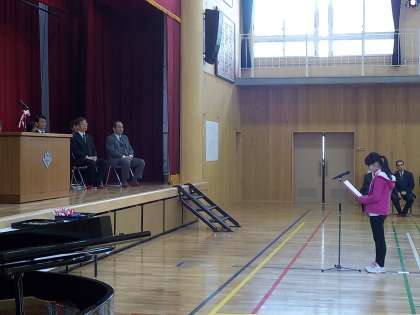 全校児童が集まる中,自治連合会会長様のご挨拶,山科区長様のご祝辞の後,学校から感謝状の贈呈,児童代表で6年生がお礼の言葉を述べました。