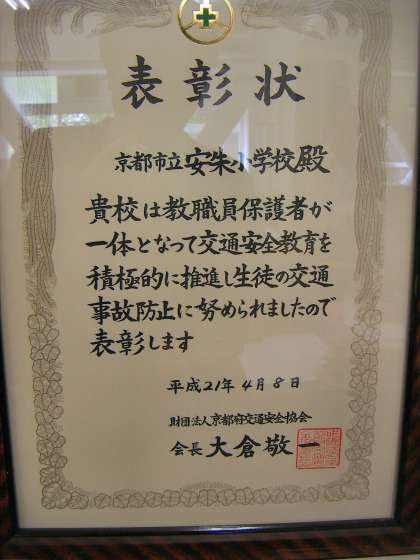 昨年度の本校の交通安全教育にたいして,京都府交通安全協会から『表彰状』をいただきました。