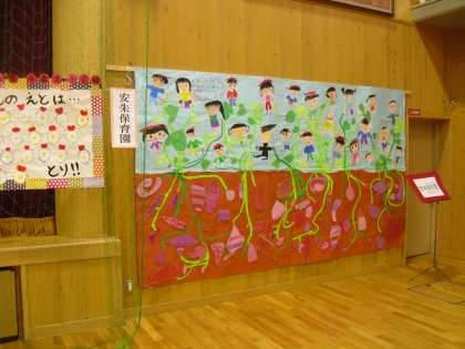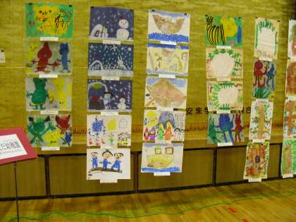 今年も,校区の安朱保育園・其枝幼稚園の園児さんたちの作品を展示させていただいています。この中には,来年度入学する皆さんもいます。かわいい作品に,見ている児童もにっこりしていました。
