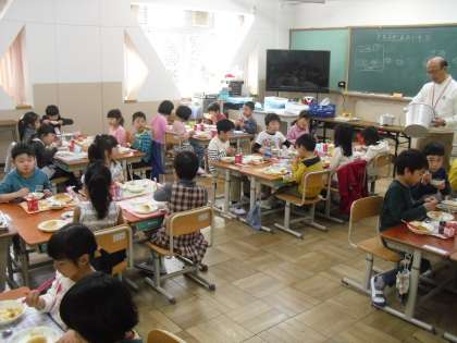 今日から給食が始まりました。1年生にとっては,はじめての給食です。今日の献立は,小型コッペパン・牛乳・スパゲティのミートソース煮・小松菜のソテー・りんごゼリーです。友達と一緒に食べる給食は,とてもおいしかったです。