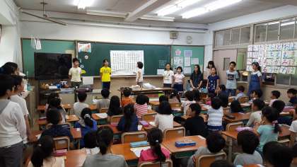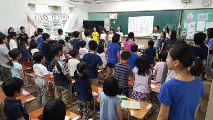 音楽の授業で,6年生が1年生に校歌を教えてあげるために,1年の教室へ授業をしにいきました。初めて校歌の練習をする1年生に,6年生が丁寧にわかりやすく教えることができました。