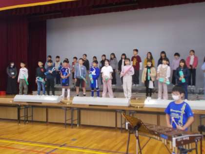 シンフォニールームでの練習とまた違い、体育館で声や音を響かせるにはどうしたらいいのかを考えながら発声や楽器の演奏に取り組みました。
