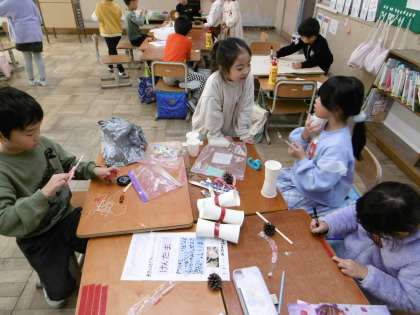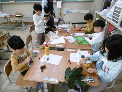 拾ってきたどんぐりや落ち葉などを使って、おもちゃを作っています。友達をアイデアを出し合いながら、ユニークな作品が出来上がってきました。