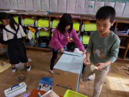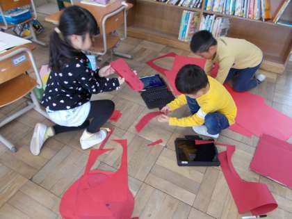 この小道具作成は海の生き物チームでした。『うみのかくれんぼ』で学習したことから、自分たちがなりきりたい生き物を考えて作っていました。