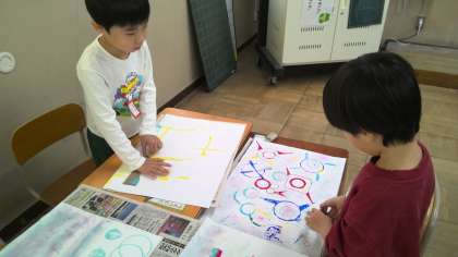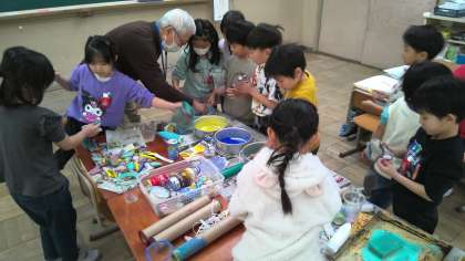 図画工作科の「うつしたかたちから」では、身の回りの物をスタンプのように使って、どんな形が紙にうつるか楽しみました。